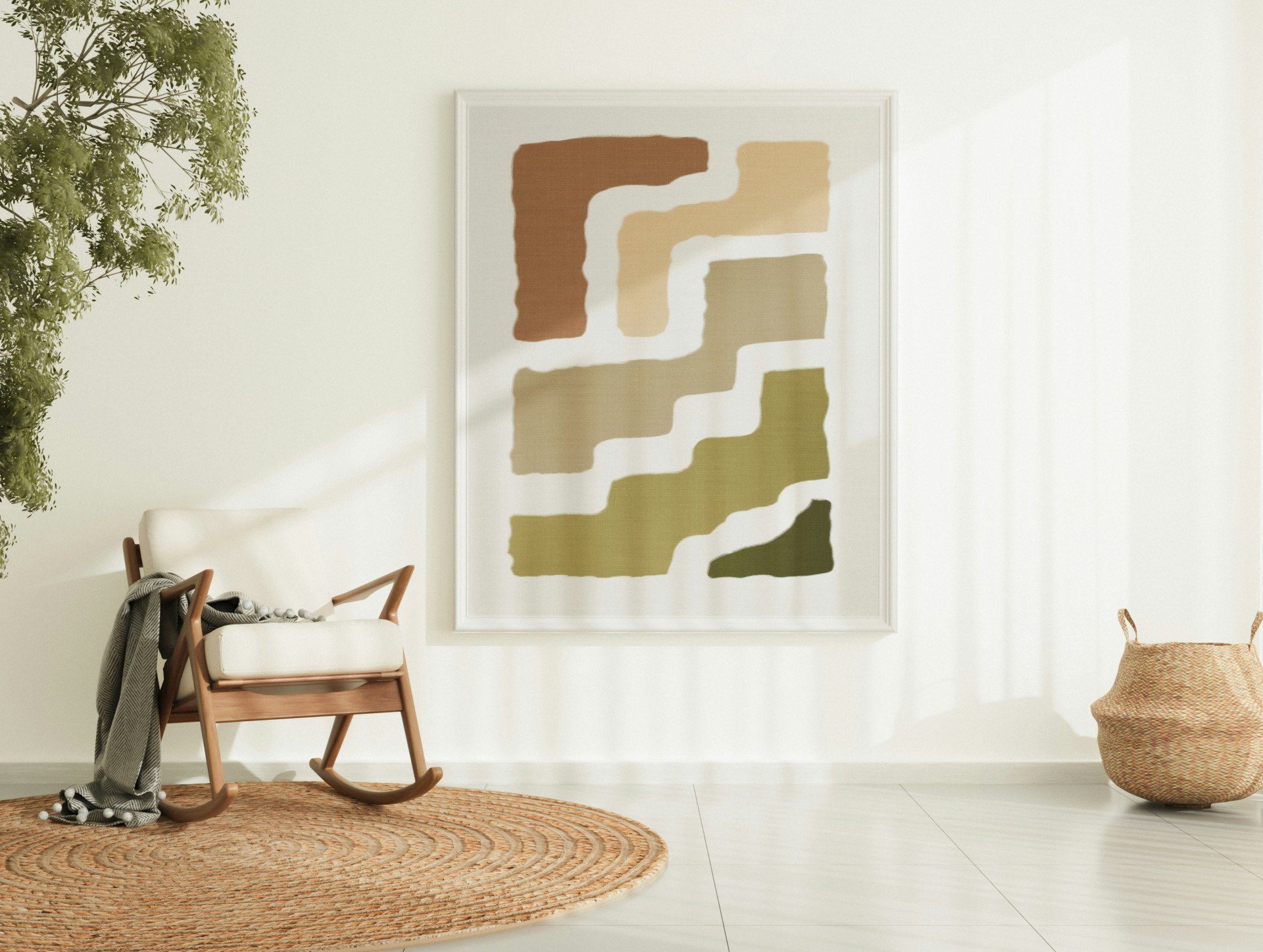 La mecedora está diseñada para uso en exteriores y está disponible en varios colores suaves, incluido el Verde Oliva. La combinación de aluminio, plástico y bambú hace que la silla sea duradera y visualmente equilibrada.
